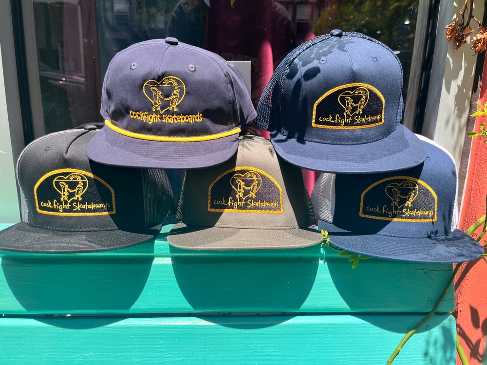 Blue rope caps with gold embroidery and same design truckers in 4 color combos.